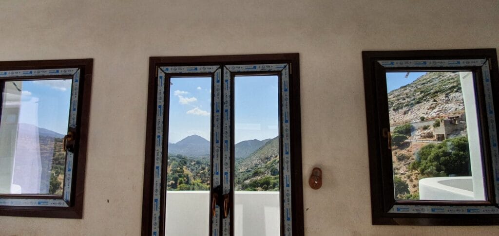 Όλα τα κουφώματα έγιναν ειδική παραγγελία για να ταιριάξουν στα σχέδια που μας υπέδειξε ο αρχιτέκτονας. Τοποθετήσαμε λευκά αλλά και καφέ παράθυρα και μπαλκονόπορτες PVC σε όλα τα δωμάτια του ξενοδοχείου.
